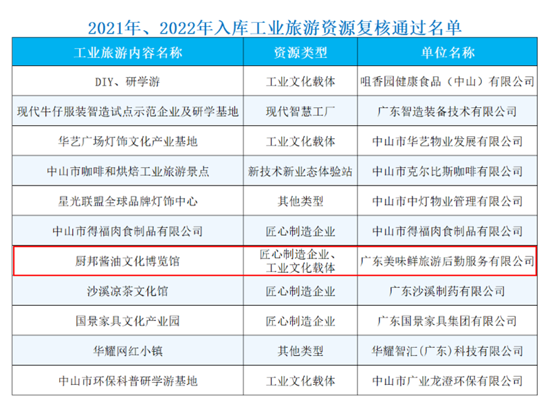 廣東工業(yè)旅游資源復(fù)核近日,廣東省工業(yè)和信息化廳、廣東省文化和旅游廳聯(lián)合公布了2024年廣東省工業(yè)旅游培育資源庫入庫名單及2021年、2022年入庫工業(yè)旅游資源復(fù)核通過名單。健康基地園區(qū)企業(yè)廣東美味鮮調(diào)味食品有限公司旗下“廚邦醬油文化博覽館”成功通過2021年、2022年入庫工業(yè)旅游資源復(fù)核。