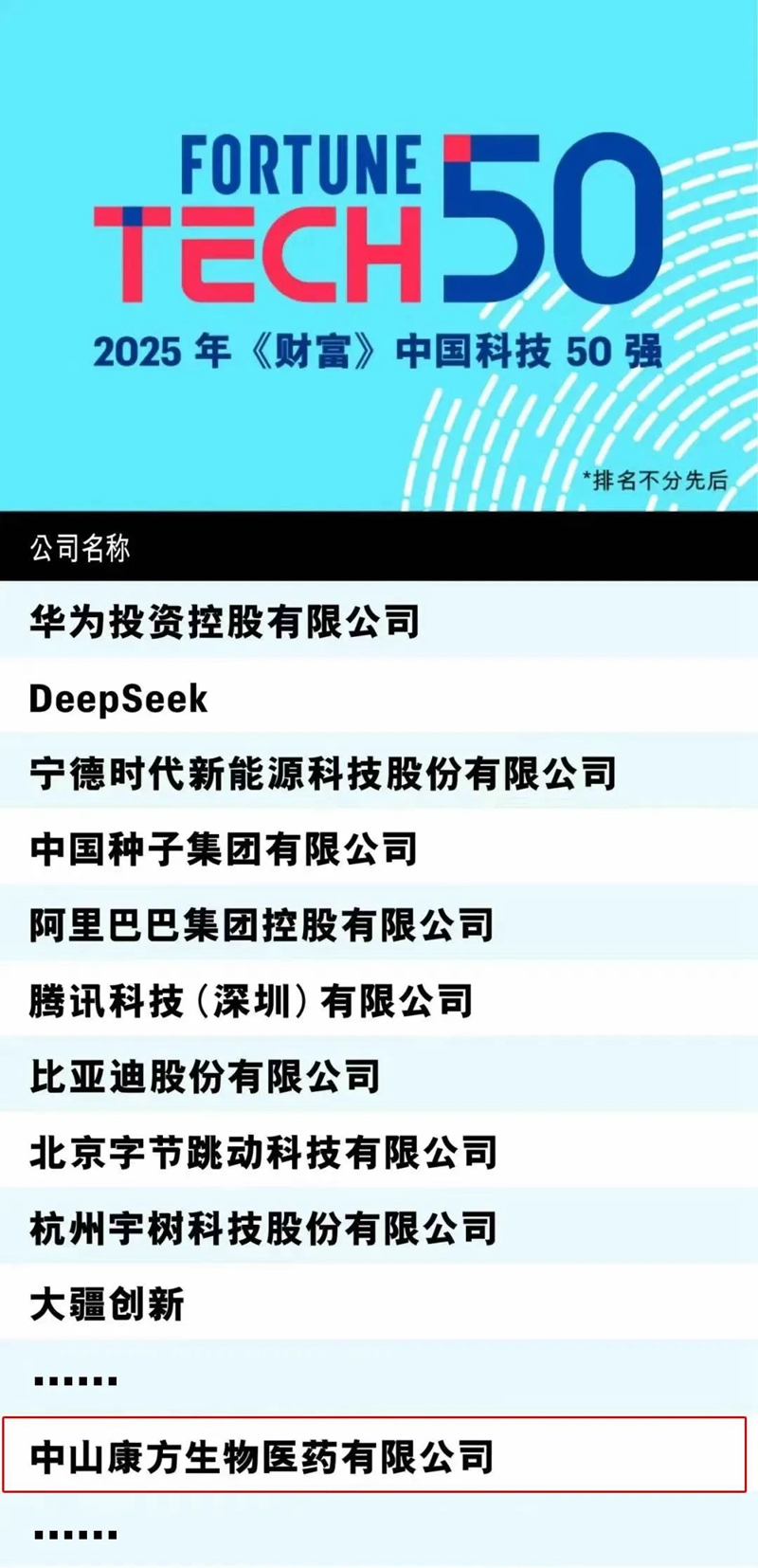 8月21日,國(guó)際權(quán)威商業(yè)雜志《財(cái)富》(Fortune)正式公布“2025年《財(cái)富》中國(guó)科技50強(qiáng)”榜單結(jié)果,健康基地園區(qū)企業(yè)康方生物憑借卓越的創(chuàng)新能力與突破性研發(fā)成果,成功入選 “中國(guó)科技50強(qiáng)”榜單。