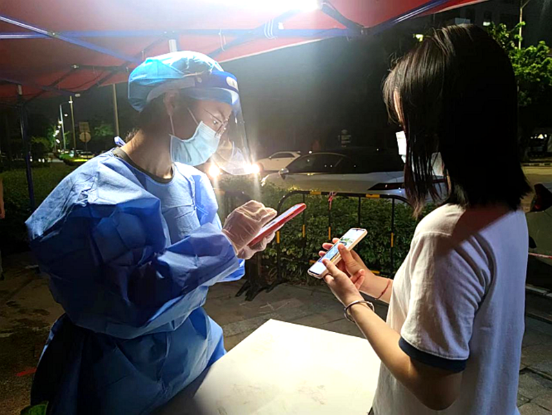 白天驕陽似火、烈日炎炎,一線醫(yī)務(wù)人員、企業(yè)志愿者們穿上防護(hù)服忍受悶熱,克服困難,一絲不茍做好核酸檢測工作;晚上披星戴月,舍小家為大家,堅(jiān)守崗位,齊心協(xié)力守護(hù)園區(qū)。他們忙碌的身影也成為現(xiàn)場最美的風(fēng)景線。